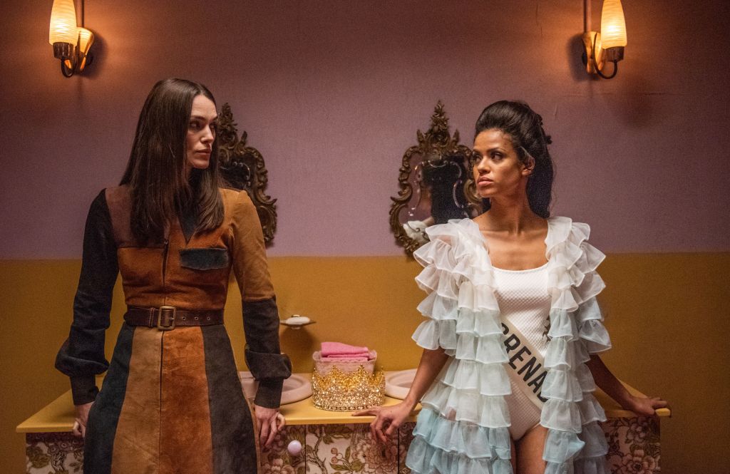 The third and perhaps most interesting point of view is introduced later in the film. Gugu Mbatha Raw plays Miss Grenada Jennifer Hosten who becomes the first Black winner of Miss World. The tension comes from Alexander and Robinson leading a disruption during the ceremony to protest how it objectifies women. Hosten and the first ever Black contestant from South Africa Pearl Janssen (Loreece Harrison) are trying to use the competition as a springboard to more opportunities and to inspire young Black girls everywhere. The best scenes are when the women talk to each other; Janssen and Hosten, Robinson and Alexander and finally Hosten and Alexander. It’s all earnest and heartfelt but the actresses bring a sensitivity and understanding that make these scenes touching. The film tries to balance their views and critique both the exploitation of beauty pageants and the sometimes bird view of white feminism.